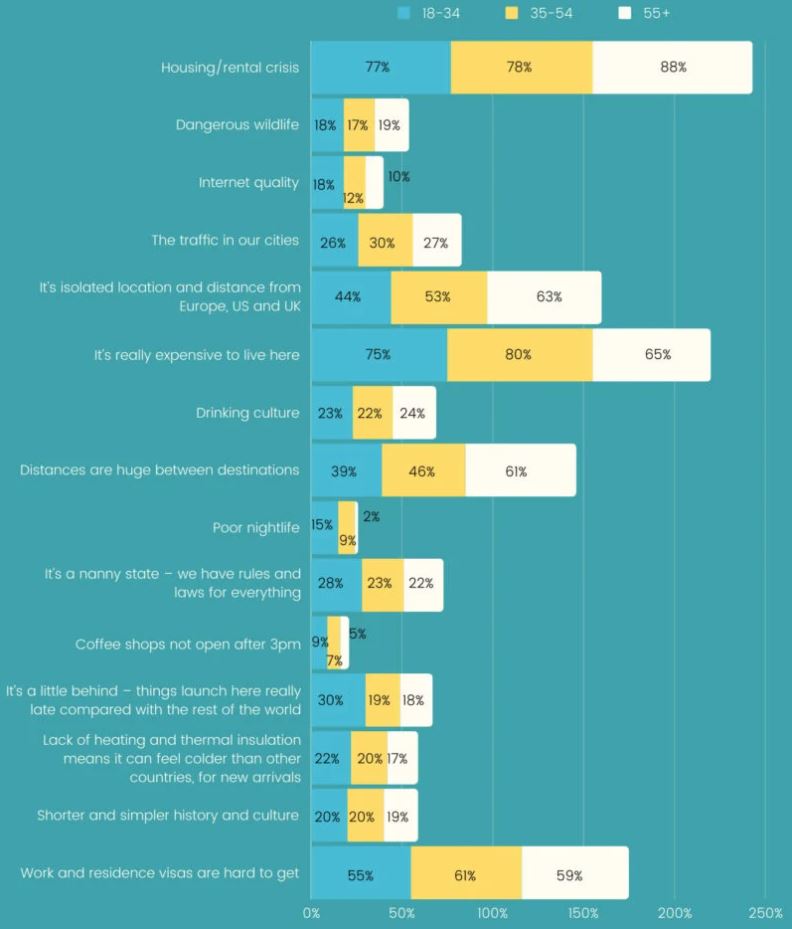 Respondents were tasked with evaluating 15 potential drawbacks of living in Australia, encompassing issues from traffic congestion to internet quality and visa complications.