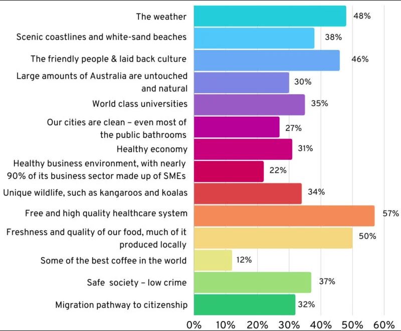Outstanding healthcare services, the freshness of Australian cuisine, and the country’s agreeable climate emerged as standout attractions.